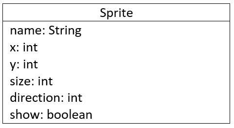 One of the things that programmers often do is draw "Class Diagrams" which represent what a class knows and can do.  A Class Diagram for the Sprite class which only focuses on the six main pieces of data would look like: