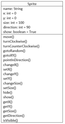Using the CreditCard and Fraction examples from above, create a Python Class called Sprite which you save in a file named Sprite.py.  This class should provide all of the data and functionality that was outlined in the class diagram shown below:
