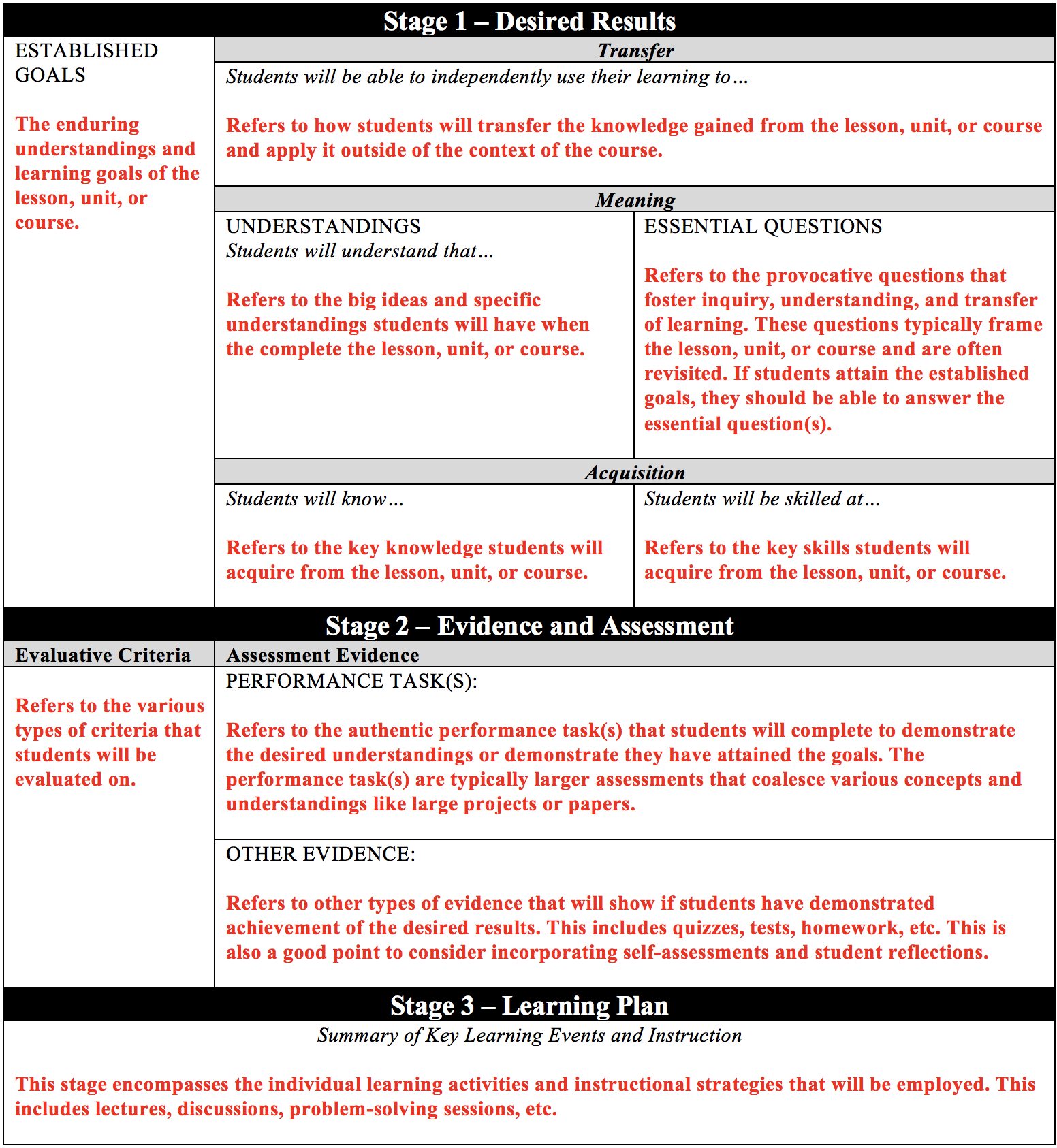 A link to the blank backward design template is provided here (https://jaymctighe.com/resources/), and it is referred to as UbD Template 2.0. The older version (version 1.0) can also be downloaded at that site as well as other resources relevant to Understanding by Design. The template walks individuals through the stages of backward design. However, if you are need of the template with descriptions of each section, please see the table below. There is also a link to the document containing the template with descriptions provided below and can be downloaded for free.