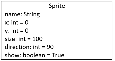 Scratch itself give it a name and will automatically add a number to this if you have more than one of the same "kind" [eg. Cloud, Cloud2, Cloud3, etc] This is done through the use of a special kind of "class variable" which is different from the "instance variables" we are discussing. We won't actually look at how to solve this in Python. Instead, we will just make the decision that the name must be provided by the creator. This is similar to what we talked about with the CreditCard class. We said that the balance can start at zero by default but the owner MUST be provided when a new instance is created.