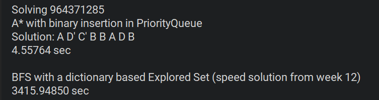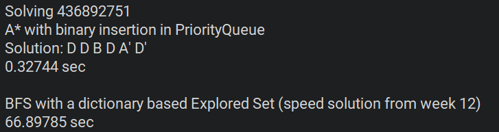 As an example this is what I got when I compared a length 6 solution board using my A* and the optimized BFS.