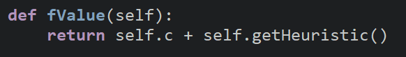 - Add in the fValue() function that returns the sum of self.cost (or self.c depending on what you named it) and self.getHeurstic()