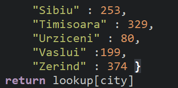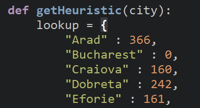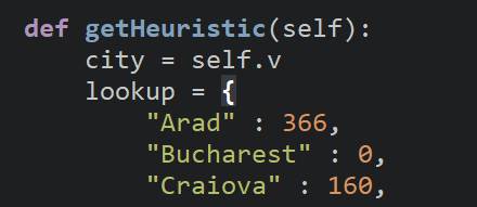 - I created a function called getHeuristic that takes in a city as a parameter and returns the straight line distance from that City to Bucharest based on the chart from my slides. [NOTE: This uses a Python dictionary as a lookup table rather than messing with a big messy set of conditionals.]