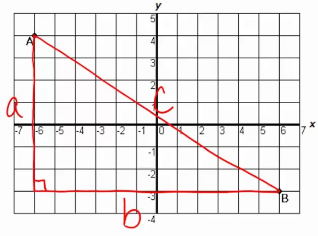 For example, the distance between (-6 , 4) and (6 , -3) - line c on the following graphic: