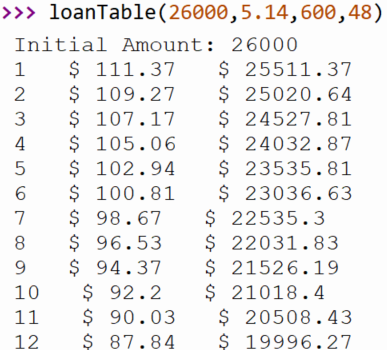 - The following is an exampe of me taking out a 26,000 loan from my bank at 5.14% interest (what Veridian CU was charging when I wrote this a while ago) and paying $600 a month for 4 years (48 months).