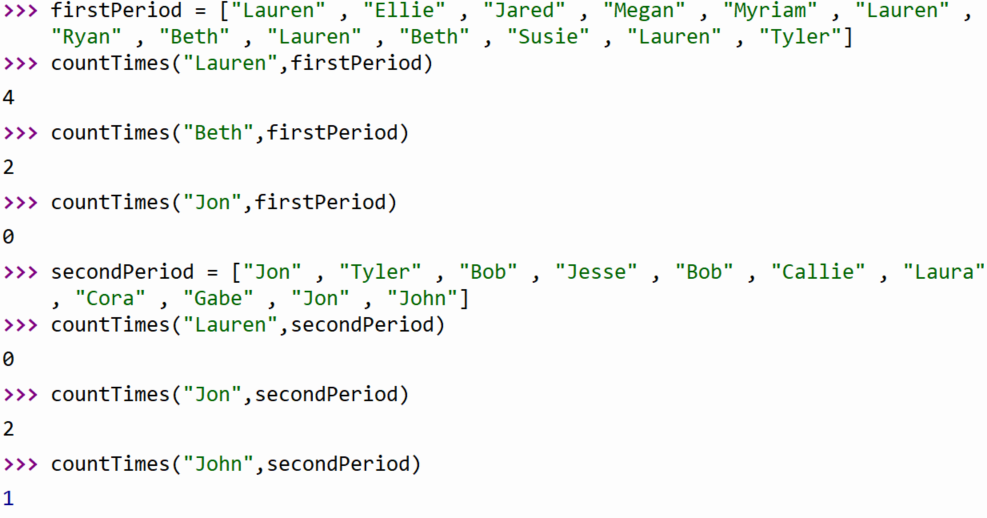 - firstPeriod = ["Lauren" , "Ellie" , "Jared" , "Megan" , "Myriam" , "Lauren" , "Ryan" , "Beth" , "Lauren" , "Beth" , "Susie" , "Lauren" , "Tyler"]