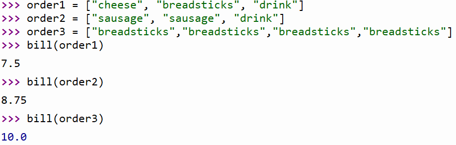 - order1 = ["cheese", "breadsticks", "drink"]