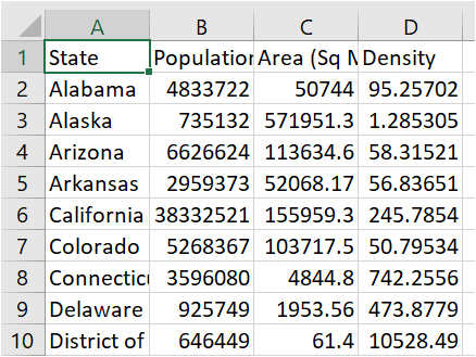 My son is a really big geography buff. He loves statistics about the various states and countries. We were having an interesting discussion about which states were the most and least populous by size. That got us interested in calculating various population densities. For this assignment you will write the code that we produced together (And yes. I wrote this code with my then 10 year old son).