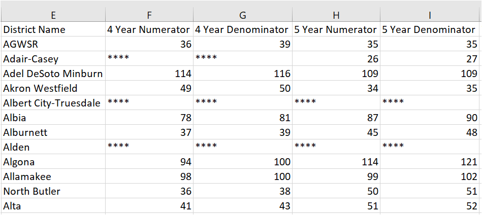 Some schools have not reported some data. For example, Adair-Casey had reported their 5 year data but not their 4 year data. Alden had not reported any data. Every field with missing data is marked with the symbol "****"