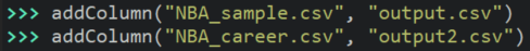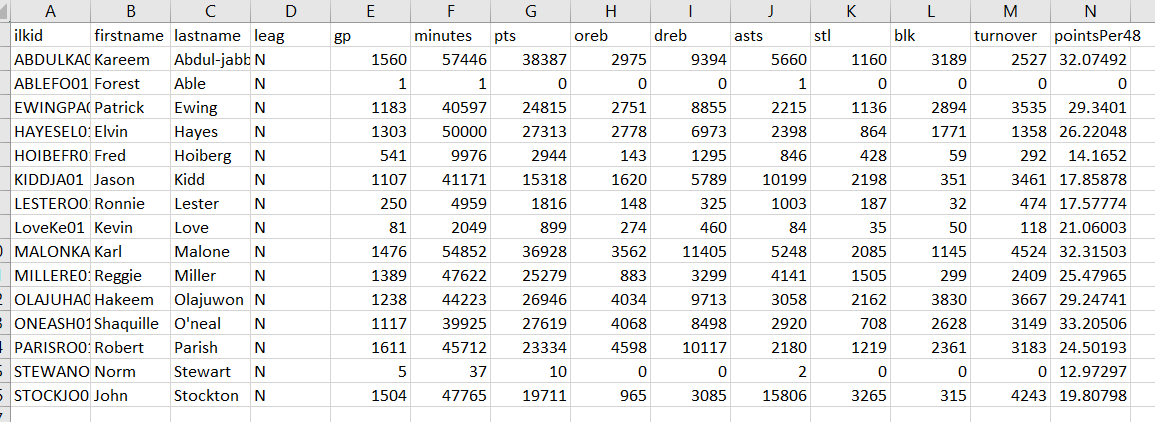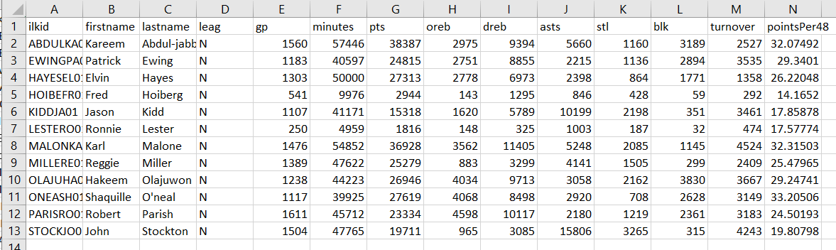 - Instead, it creates a new file with the name provided as the output filename parameter. This file is identical to the input file with the addition of a new column at the end containing the information calculated by the pointsPer48() function from Task One for that player.