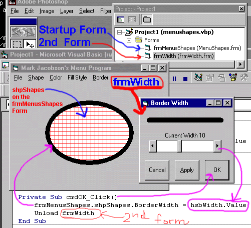 The assignment requires that you have two Forms. Here is a snapshot of the running program, with the 2nd form invoked by the main form. One is the main application form (shown here on the menus.html page), the other is a dialog box that is invoked when you choose the Border menu, Width command from your custom made menu user interface.