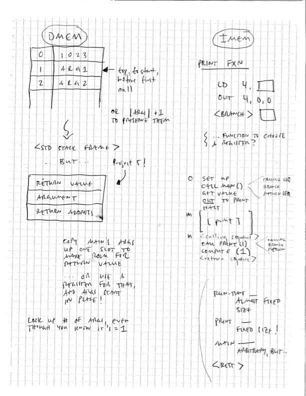 We saw a program that is quite similar to the goal output of Project 5 when we first studied TM a few sessions back: the solution to Exercise 5. This TM program consists of a prologue that calls the main function, a main function that calls a square function, and a square function.